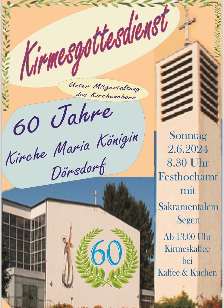 Am Sonntag, den 2. Juni 2024, laden wir Sie herzlich ein, gemeinsam mit uns das 60-jährige Jubiläum der Kirche Maria Königin in Dörsdorf zu feiern. Der festliche Kirmesgottesdienst, beginnt um 8.30 Uhr und wird vom Kirchenchor mitgestaltet.