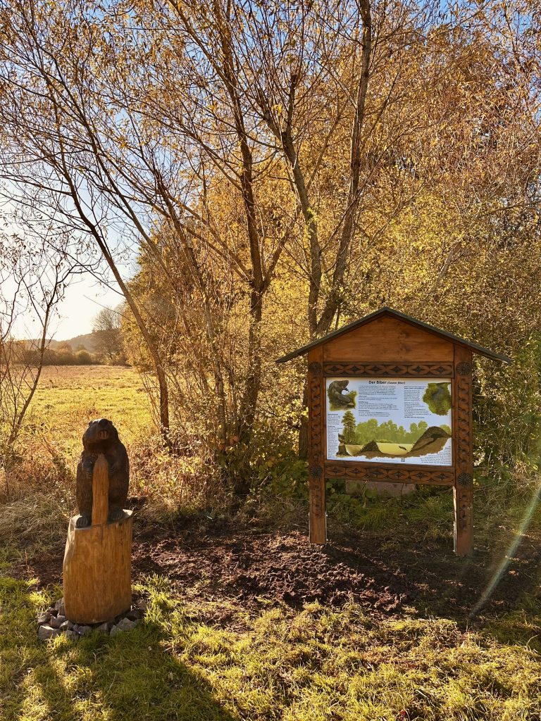 Biberfigur und Infotafel am Dörsdorfer Rundwanderweg