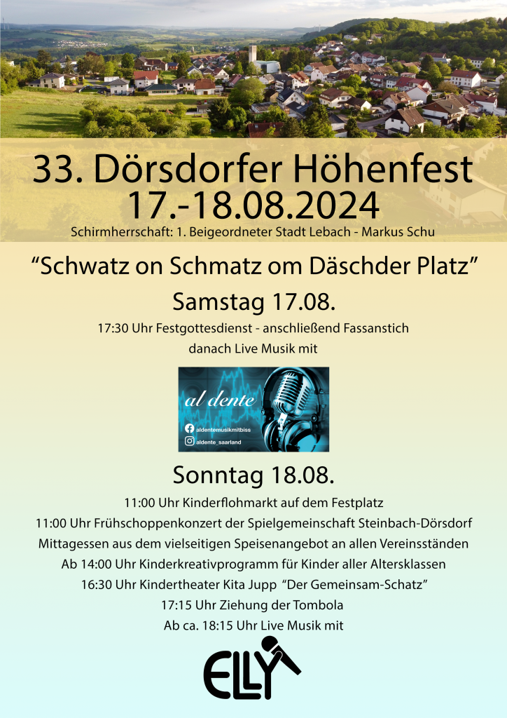 Das Dörsdorfer Höhenfest geht am kommenden Samstag und Sonntag, 17./18. August, auf dem Bernhard-Scholl-Platz in seine 33. Auflage. Die Besucher dürfen sich, getreu dem traditionellen Mott: „Schmatz on Schwatz om Däschder Platz“ auf ein buntes Programm und kulinarische Leckereien freuen.