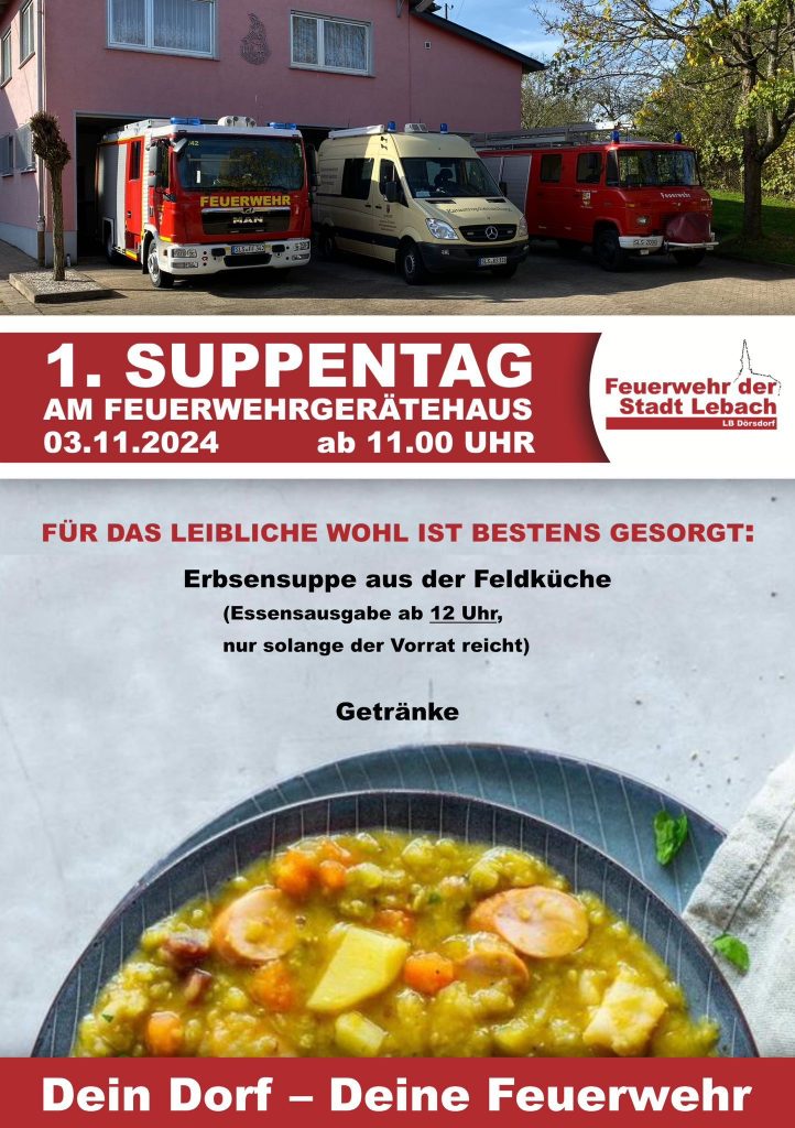 Am 03. November 2024 lädt die Feuerwehr Dörsdorf zum 1. Suppentag ins Feuerwehrgerätehaus ein! Ab 11.00 Uhr heißen wir dich herzlich willkommen.